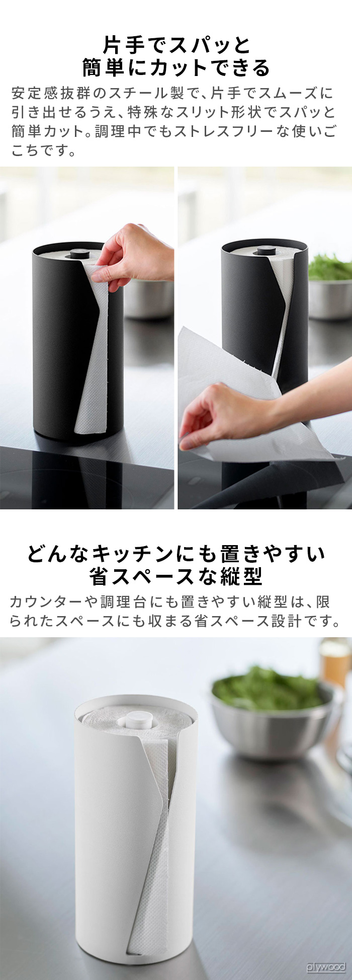 キッチンペーパーを隠して生活感をオフ! 片手でカットできるホルダー スタイリッシュなデザインでキッチンペーパーを隠して収納。キッチンまわりの生活感をスッキリとオフできるキッチンペーパーホルダーです。スチール製のホルダーで安定感抜群!片手でスムーズに引き出せるうえ、特殊なスリット形状で簡単にカットでき、調理中でもストレスなく使えます。選べる2サイズです。 ※セット販売ではありません。 | ||