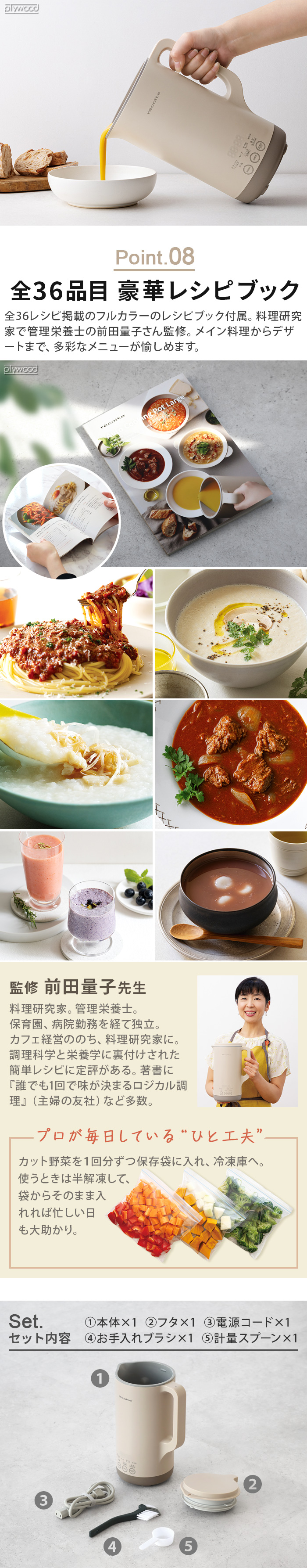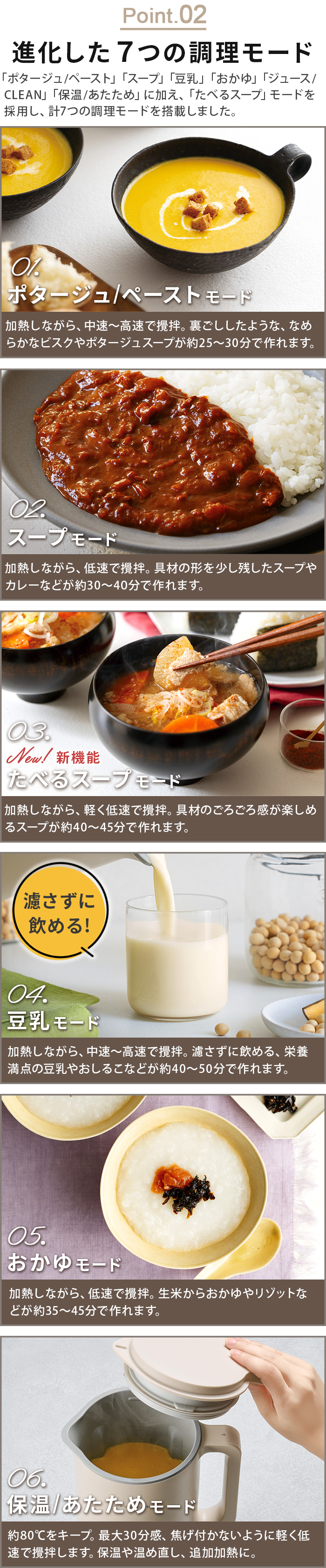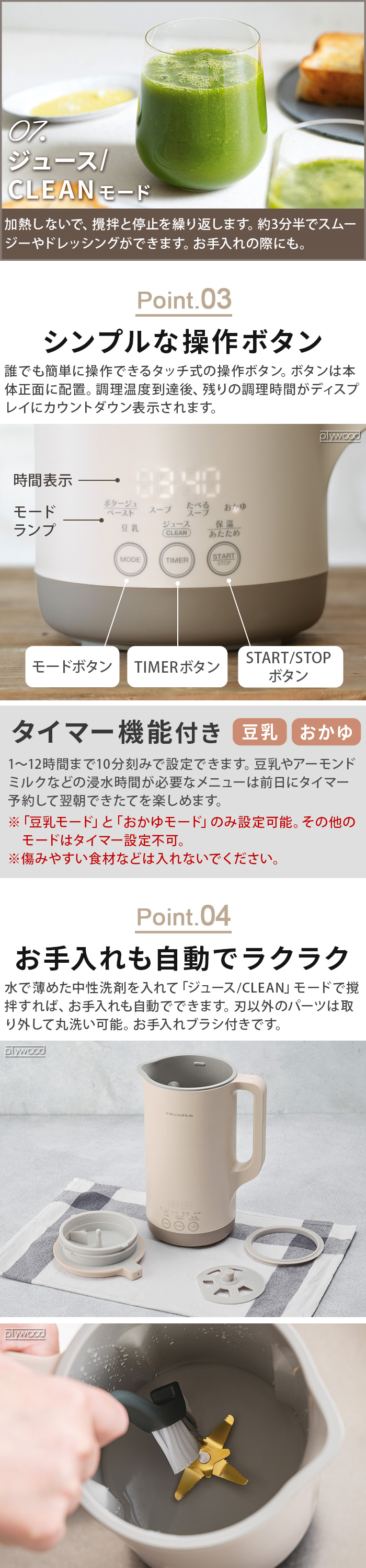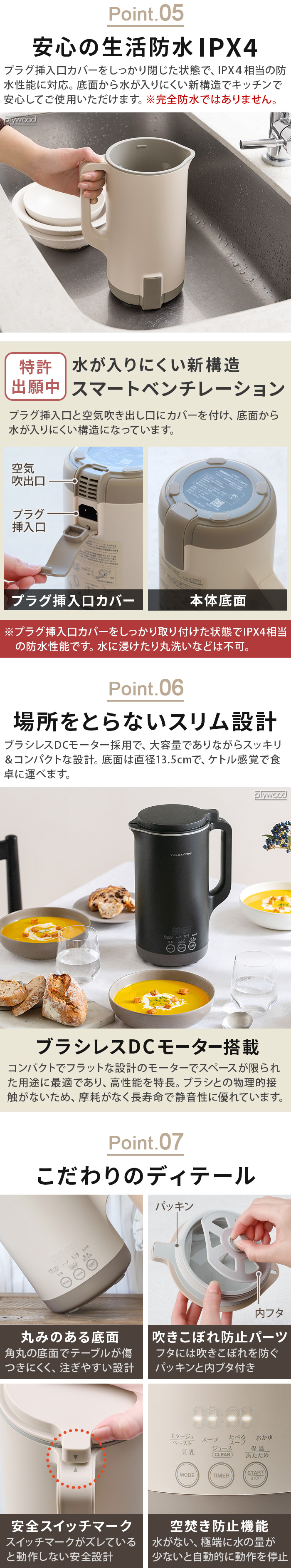 | 本体はプラグ挿入口カバーをしっかり取り付けた状態でIPX4相当の防水性能です。 完全防水ではありません。水に浸けたり、丸洗いなどはしないでください。 タイマー機能付き。 ※「豆乳モード」と「おかゆモード」のみ設定可能。その他のモードはタイマー設定不可。 ※傷みやすい食材などは入れないでください。 空焚き防止機能付き。 計量スプーン:1杯で25ml(乾燥大豆 約20g分になります) |
