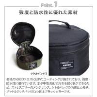 ケトルバッグの内側生地はCAMO柄になっているので、ギア好き男子の心をくすぐること間違いなし!ポット&ダッチバッグの内側はターポリン生地を採用しており、汚れても拭き取りやすい素材になっています。