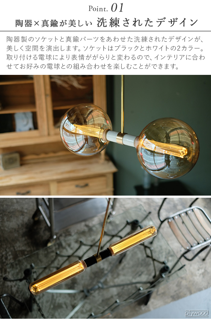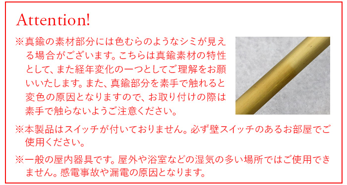 | 電球は別売りです。 真鍮の素材部分には色むらのようなシミが見える場合がございます。こちらは真鍮素材の特性として、また経年変化の一つとしてご理解をお願いいたします。また、真鍮部分を素手で触れると変色の原因となりますので、お取り付けの際は素手で触らないようご注意ください。 本製品はスイッチが付いておりません。必ず壁スイッチのあるお部屋でご使用ください。 一般の屋内器具です。屋外や浴室などの湿気の多い場所ではご使用できません。感電事故や漏電の原因となります。 適合ランプ以外の使用禁止。 可燃物をかぶせたり、近づけての使用禁止。 |
