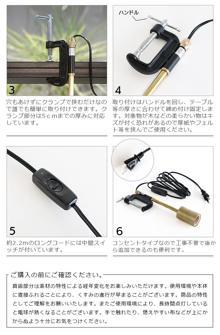 | 真鍮素材の特性による経年変化をお楽しみいただけます。使用環境や本体に直接ふれることにより、くすみの進行が早まることがございます。商品の特性としてご理解をお願いいたします。 ご使用時、壁から近い場所や布など燃えやすいものがかからないよう十分にお気をつけください。 ハンドルの締めすぎはテーブル等への傷、クランプ本体の破損の原因となりますのでご注意ください。 使用可能最大ワット数は60Wまでとなります。それ以上のものはご使用にならないでください。 |