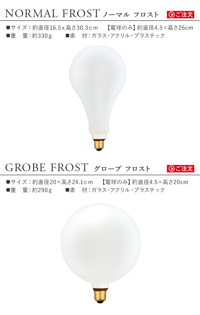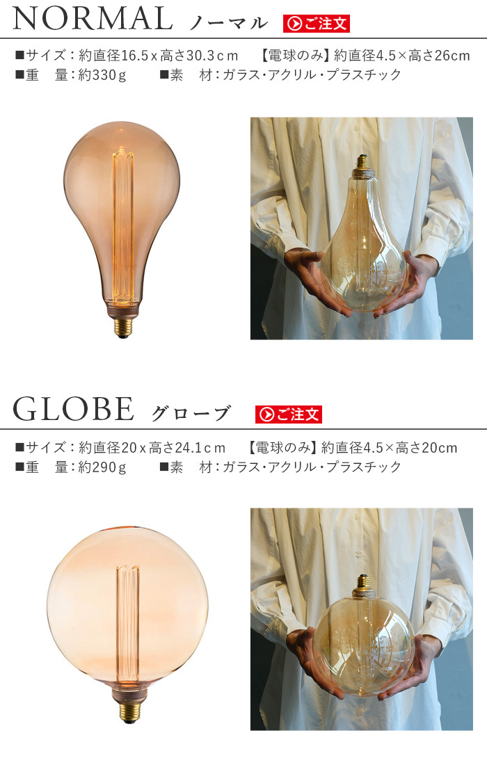 | NORMAL:(約)直径16.5×高さ30.3cm (電球のみ:(約)直径4.5×高さ26cm) GLOBE:(約)直径20×高さ24.1cm (電球のみ:(約)直径4.5×高さ20cm) |