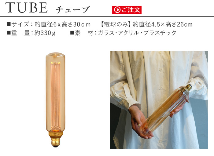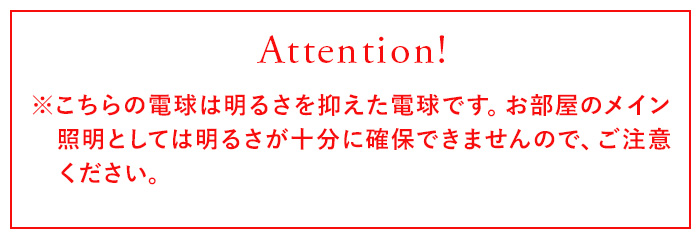 | こちらは電球のみとなります。別途口金E26の照明器具をご用意ください。 調光機能対応 こちらの電球は明るさを抑えた電球です。お部屋のメイン照明としては明るさが十分に確保できませんので、ご注意ください。 |