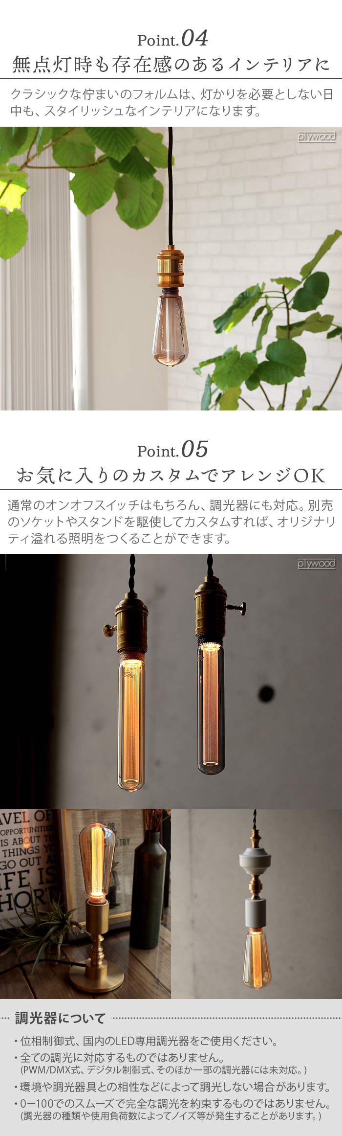 | 一般のご家庭や調光器が付いていない通常のオンオフスイッチにももちろんお使いいただけます。 位相制御式、国内のLED専用調光器をご使用ください。(PWM/DMX式、デジタル制御式、そのほか一部の調光器には対応しておりません。) 全ての調光に対応するものではありません。またご使用の環境、調光器具との相性などによって調光しない場合があります。 0−100でのスムーズで完全な調光を約束するものではありません。 調光器の種類や使用負荷数によってはノイズやちらつきが発生することがあります。 |