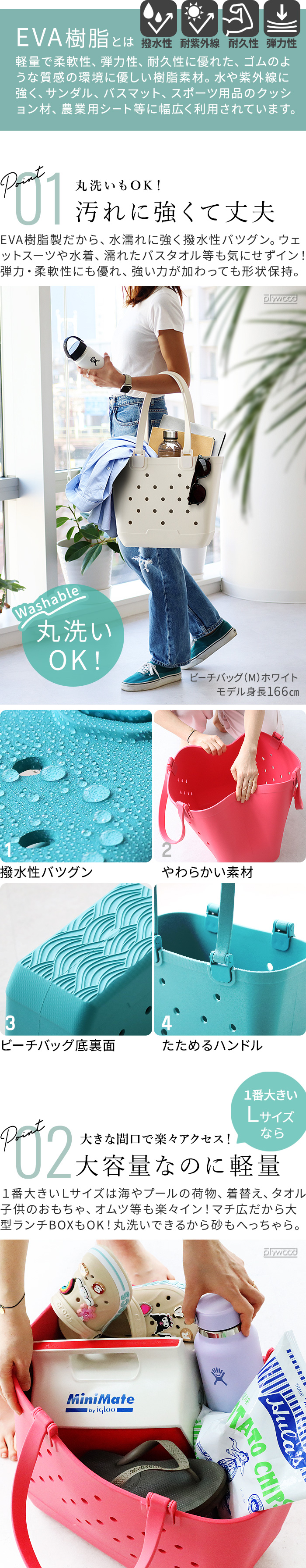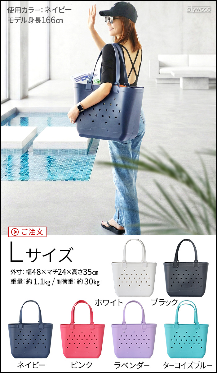 | ビーチバッグLサイズは別売 火のそばや直射日光の当たる場所、高温になる車内などに放置しないでください。熱により変形、収縮、軟化することがあります。 素材の特性上、一度切れ目が入るとそこから簡単に裂けてしまうことがあります。カッターや鋭利な角のあるものを直接いれないでください。 長時間重いものを載せたり、強い圧力をかけ続けたりすると、形が戻らなくなる(変形する)場合があります。 他の素材と密着させたまま保管すると、色移りする場合があります。 摩擦などにより脱色や色移りすることがありますのでご注意ください。 |