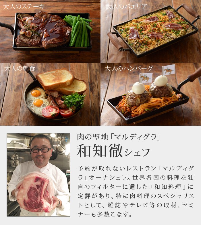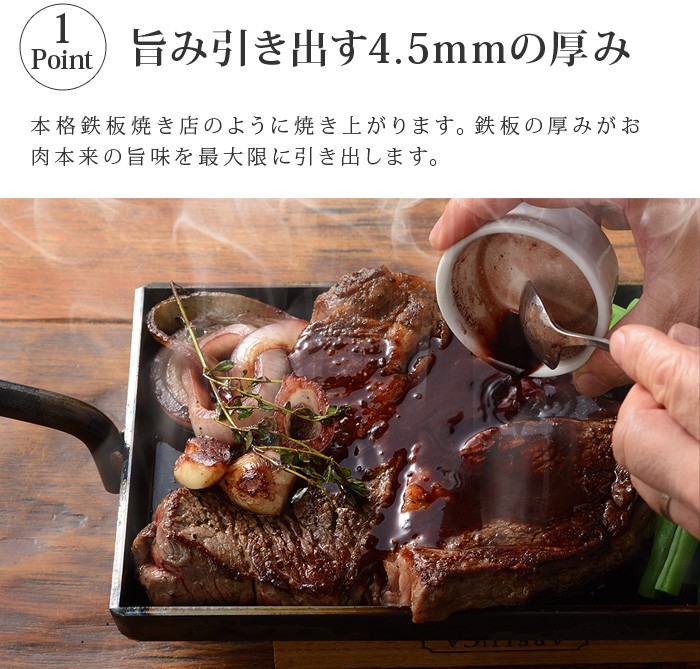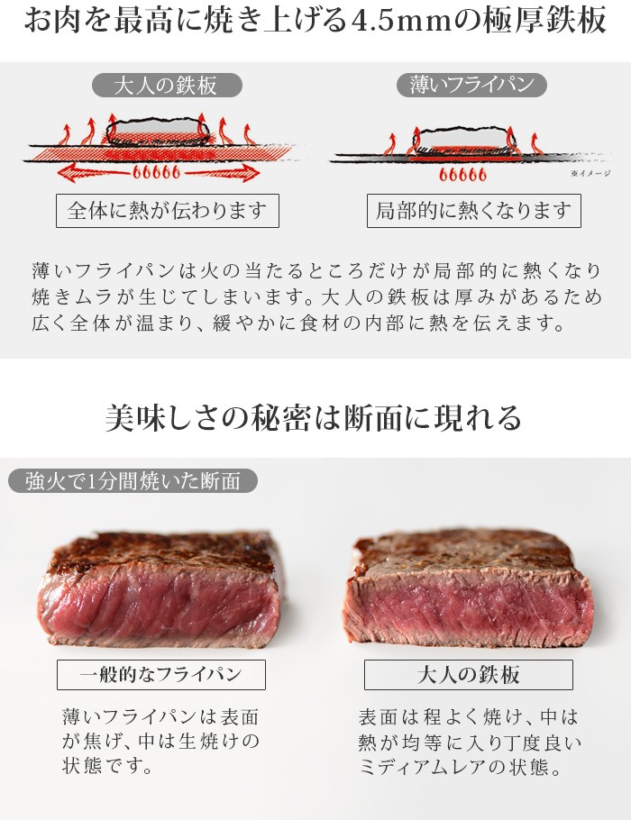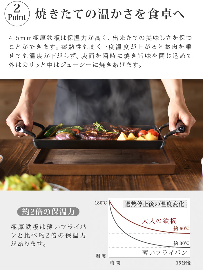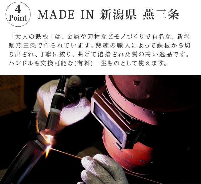 | 熱くなった鉄板はとても高温になります。必ず厚めの鍋敷きをご使用ください。 通常より厚く重い鉄板を加工する為、材料表面に線のような跡が入りますが使用上には問題ありません。 ハンドルは天然素材使用のため、木目や色味等には個体差があります。ご希望の木目や形状等のご要望はお受け致しかねます。また、ご希望とは異なる等の理由による返品交換は致しかねます。予めご了承の上お買い求め下さいませ。 高温のまま冷水をかけるなど、急激に冷やすと変形の原因になります。 |
