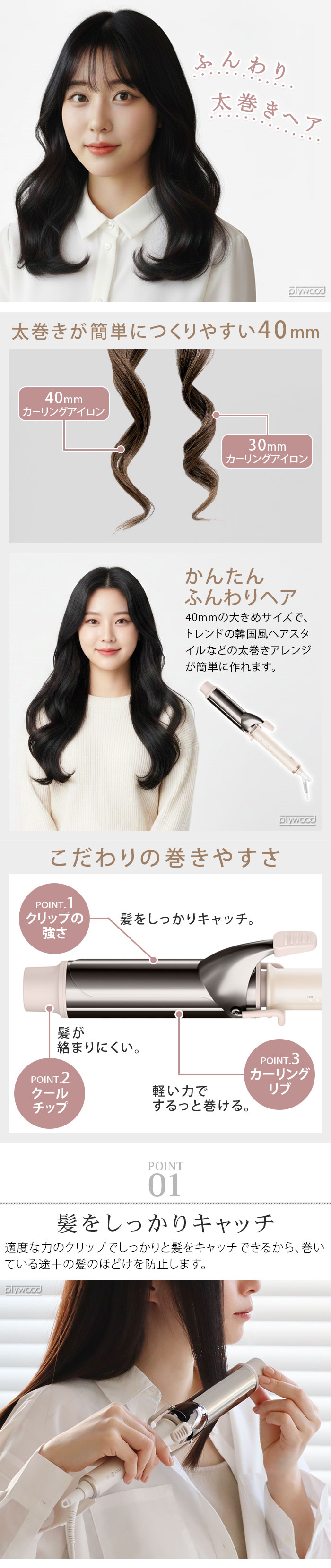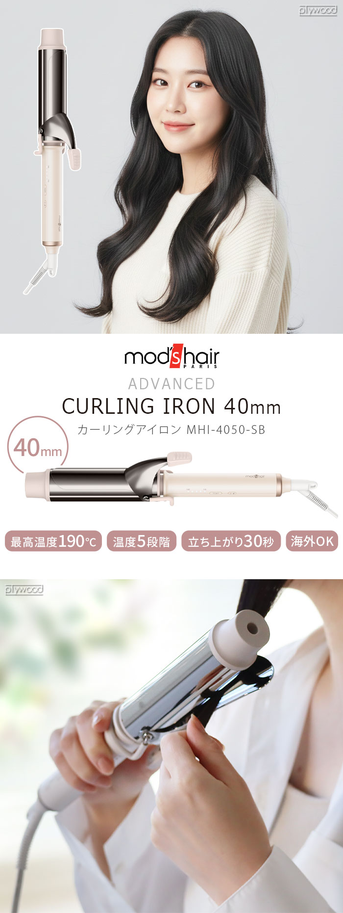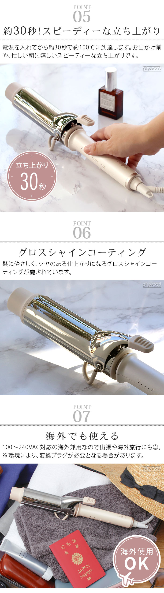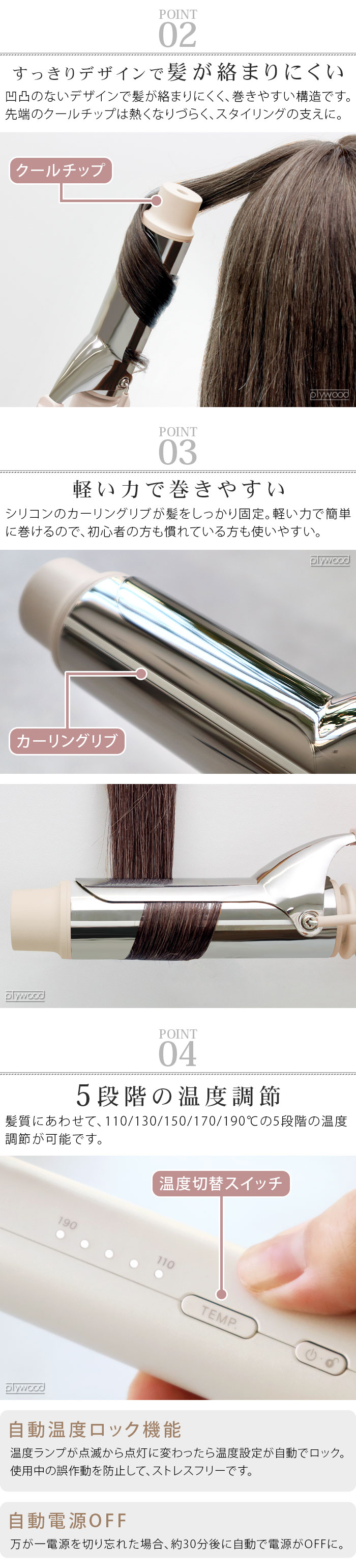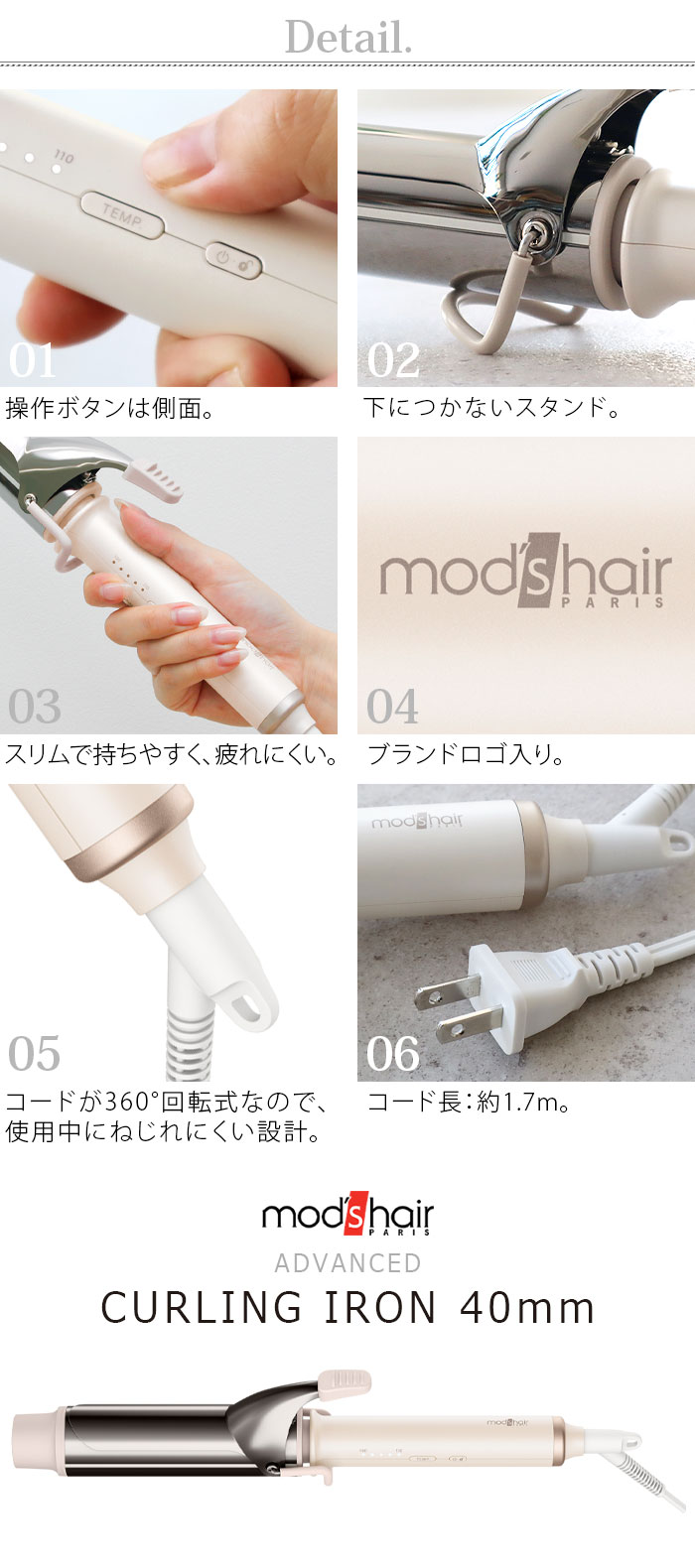 | ・最高温度190℃ ・5段階調節温度設定(110/130/150/170/190℃) ・立ち上がり約30秒(※100℃時点) ・グロスシャインコーティング ・海外兼用 ・軽い力でくるっと巻けるカーリングリブ付き ・自動電源オフ機能(電源を入れた時点から約30分後) ・下につかないスタンド付き |