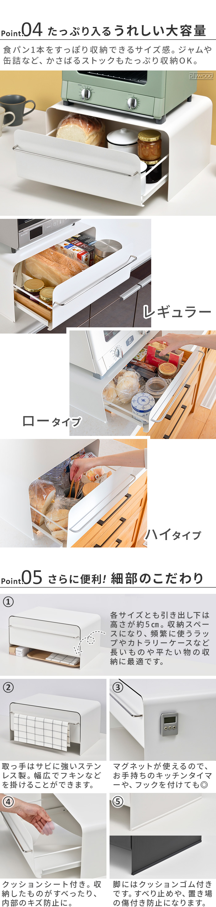 キッチン周りをすっきり収納♪ トースターラック兼ブレッドケース ごちゃつきがちなキッチン周りをすっきり整理できる、おしゃれなトースターラック兼ブレッドケース「UtaU ブレッドドロワー」に新サイズが仲間入り!幅と奥行、基本構造はそのままによりご自宅のキッチンにフィットします♪すっきり片付いた後は、使い勝手のよいキッチンに変身するはずです。 | ||||