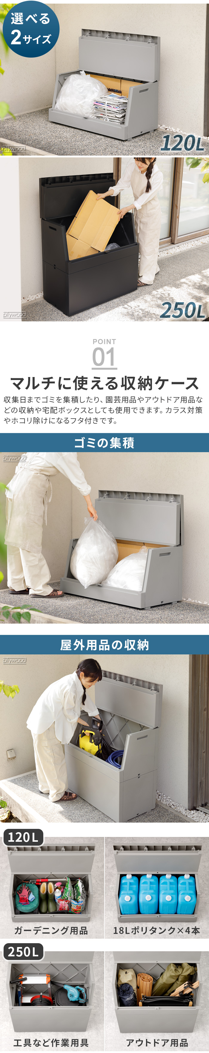 大容量なのに省スペース マルチに使える 屋外ストッカー 景観を損なわないシンプルデザインの屋外ストッカーの登場です。収集日までゴミを管理したり、ガーデニングなどの屋外用品の収納や、宅配ボックスとしても使用できます。奥行45cmのスマートな設計でベランダ収納やガレージや家の中での収納にもおすすめです。※防水構造ではありません。 |