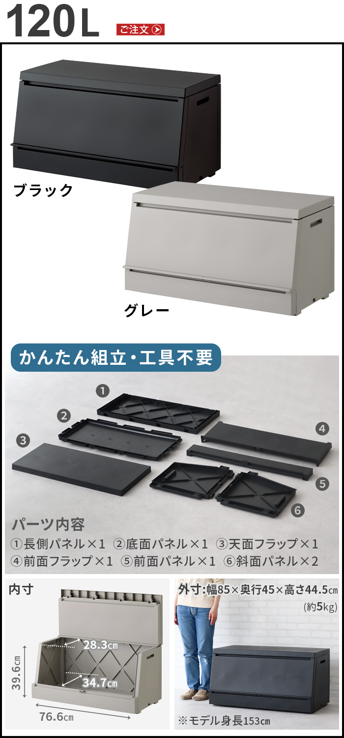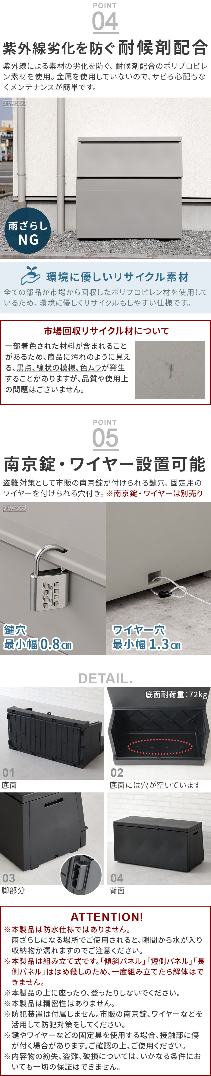 | 本製品は防水仕様ではありません。雨ざらしになる場所でご使用されると、隙間から水が入り収納物が濡れますのでご注意ください。 本製品は組み立て式です。「傾斜パネル」「短側パネル」「長側パネル」ははめ殺しのため、一度組み立てたら解体はできません。 本製品の上に座ったり、登ったりしないで下しないでください。 本製品は精密性はありません。 防犯装置は付属しません。市販の南京錠、ワイヤーなどを活用して防犯対策をしてください。 鍵やワイヤーなどの固定具を使用する場合、接触部に傷 が付く場合があります。ご確認の上、ご使用ください。 内容物の紛失、盗難、破損については、いかなる条件においても一切の保証はできません。 一部着色された材料が含まれることがあるため、商品に汚れのように見える、黒点、線状の模様、色ムラが発生することがありますが、品質や使用上の問題はございません。 |