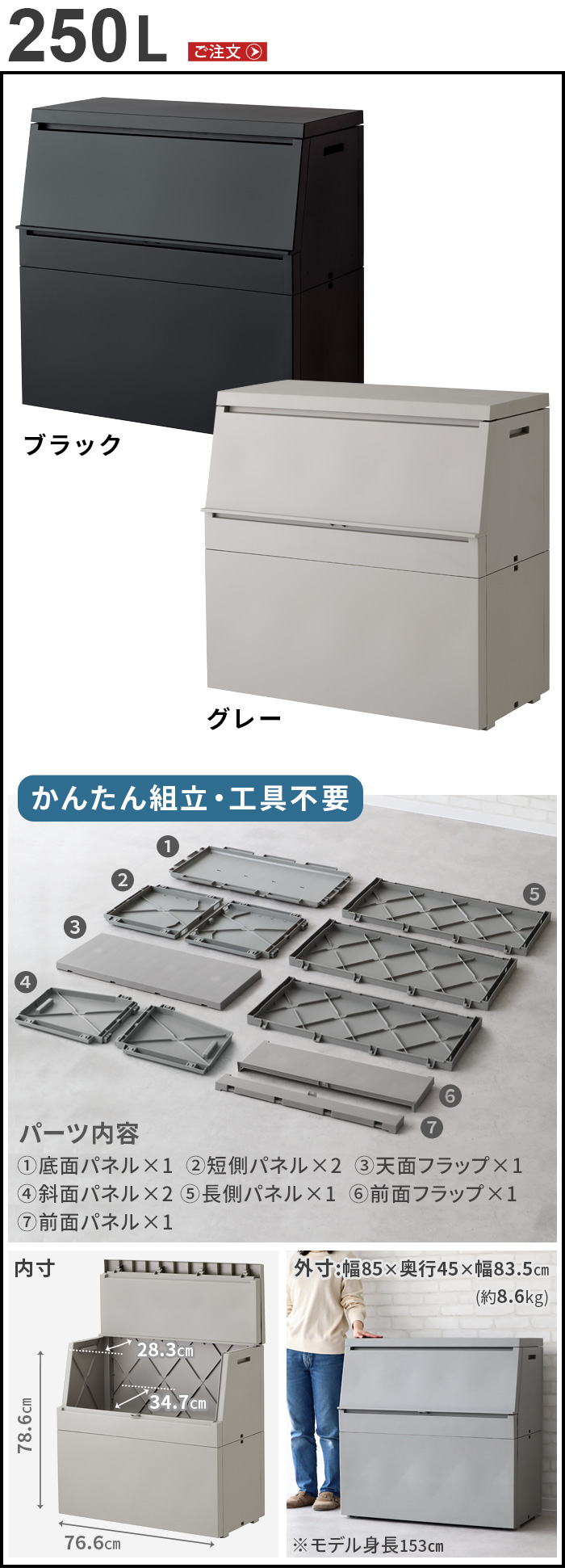| [120L] 長側パネル×1、底面パネル×1、天面フラップ×1、前面フラップ×1、前面パネル×1、斜面パネル×2 [250L] 長側パネル×1、底面パネル×1、天面フラップ×1、前面フラップ×1、前面パネル×1、短側パネル×2、斜面パネル×2 |