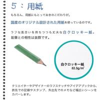 ラフな風合いを持ちつつも丈夫な白クロッキー紙。クリエイターやデザイナーのラフスケッチやアイディアブック、旅先での記録スタンプ、外出先でのメモなど、幅広いシーンをカバーします。厚さは52.3g/m