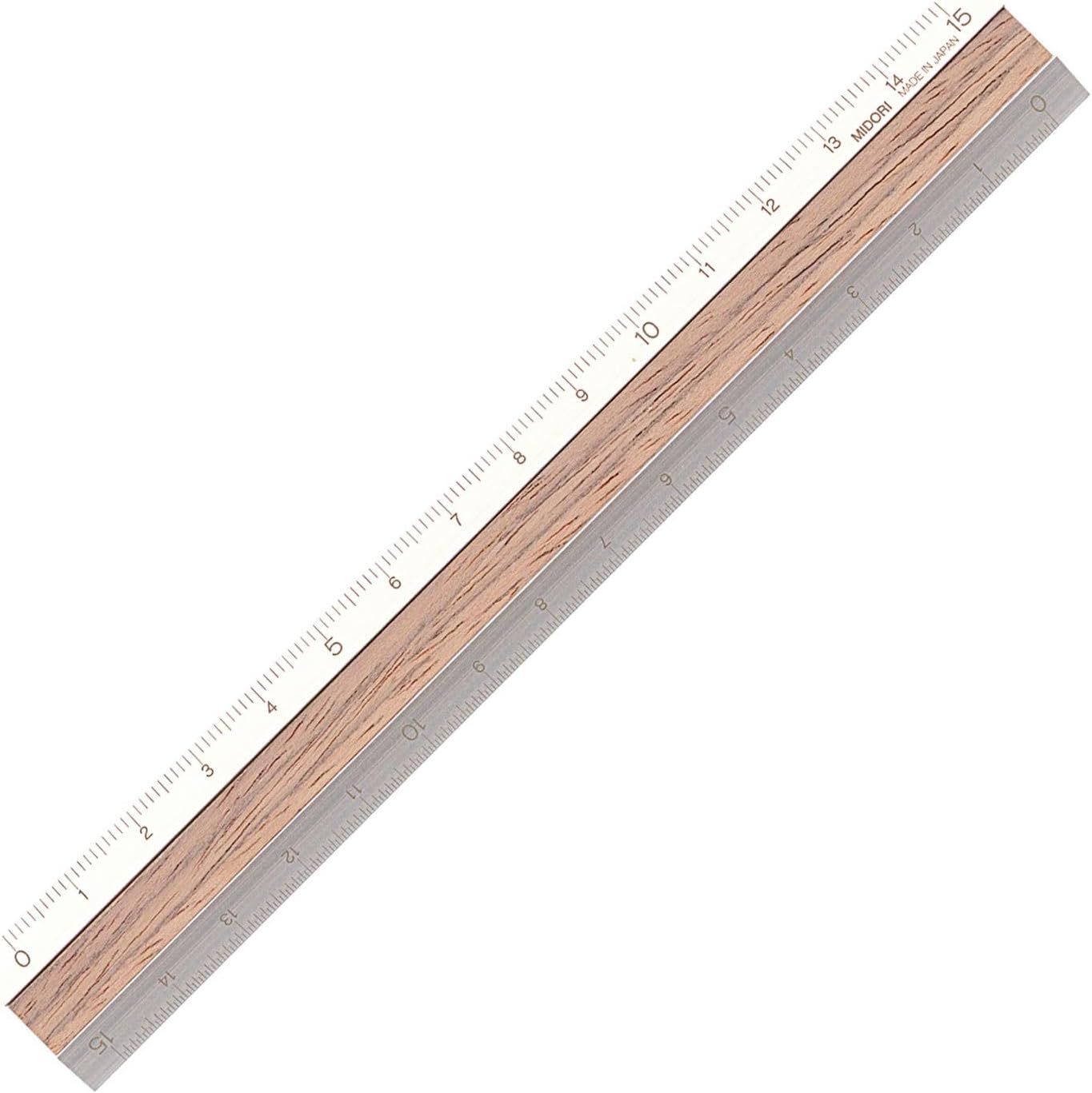 丈夫なアルミと、ナチュラルな天然木を使用した15cm定規。長く使っても消えないレザー刻印目盛り。