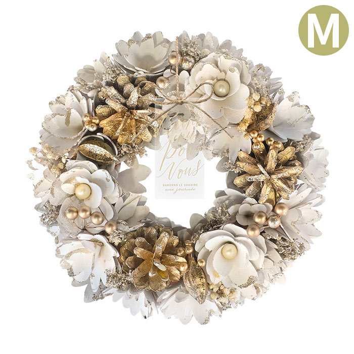 高級感のある特別なクリスマスをイメージしたリース。明るめの色と金銀に輝くパーツの組み合わせが清らかな夜を彩ります。