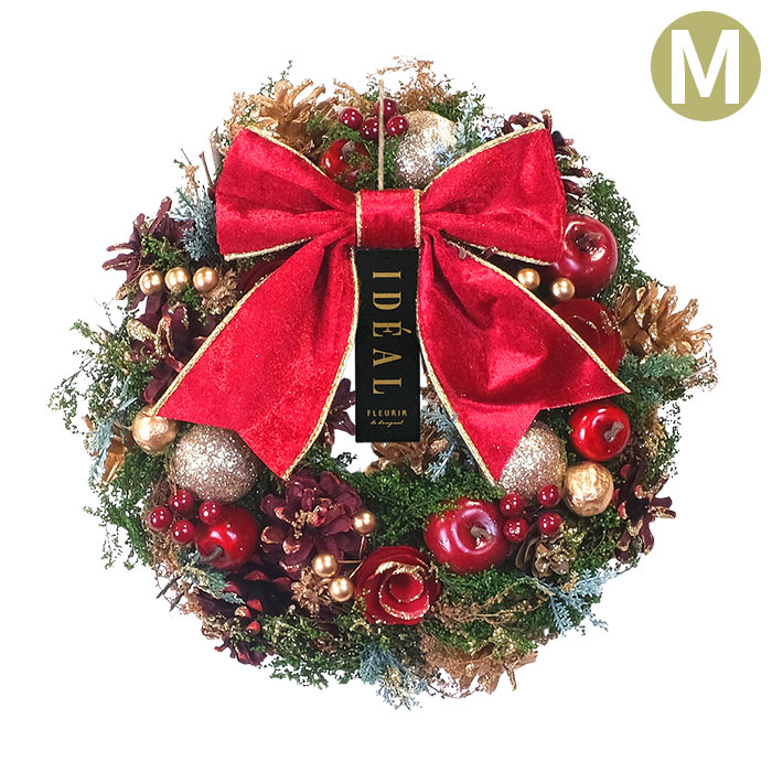 深い赤色を基調に、キラキラ輝く木の実やパーツを使用。大人気のクリスマス定番リースです。