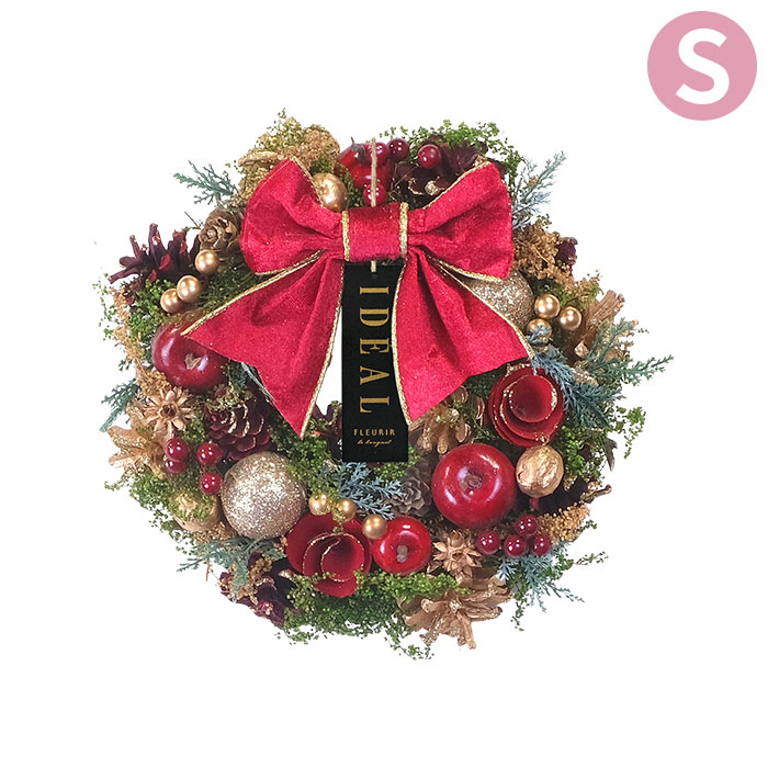 深い赤色を基調に、キラキラ輝く木の実やパーツを使用。大人気のクリスマス定番リースです。
