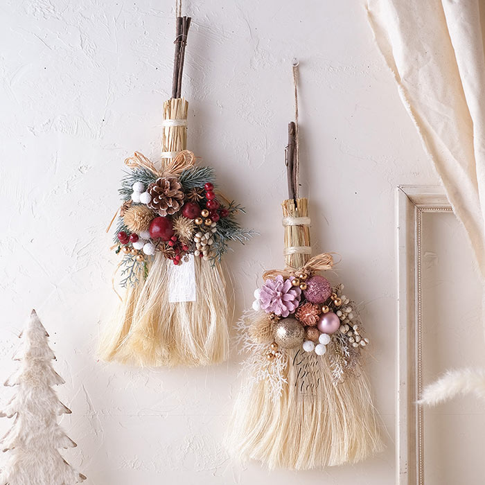 繊細な穂先とたくさんの実・ボールで飾った、クリスマスにぴったりのおしゃれな箒型スワッグです。