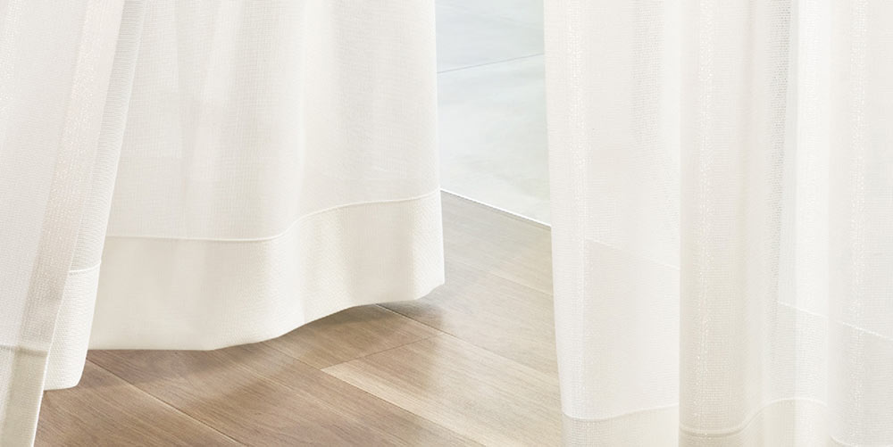 分繊糸による繊細で上品な光沢感と外側からはマットに見えるレース。遮熱・UVカットの機能がついたシアーカーテン生地です。