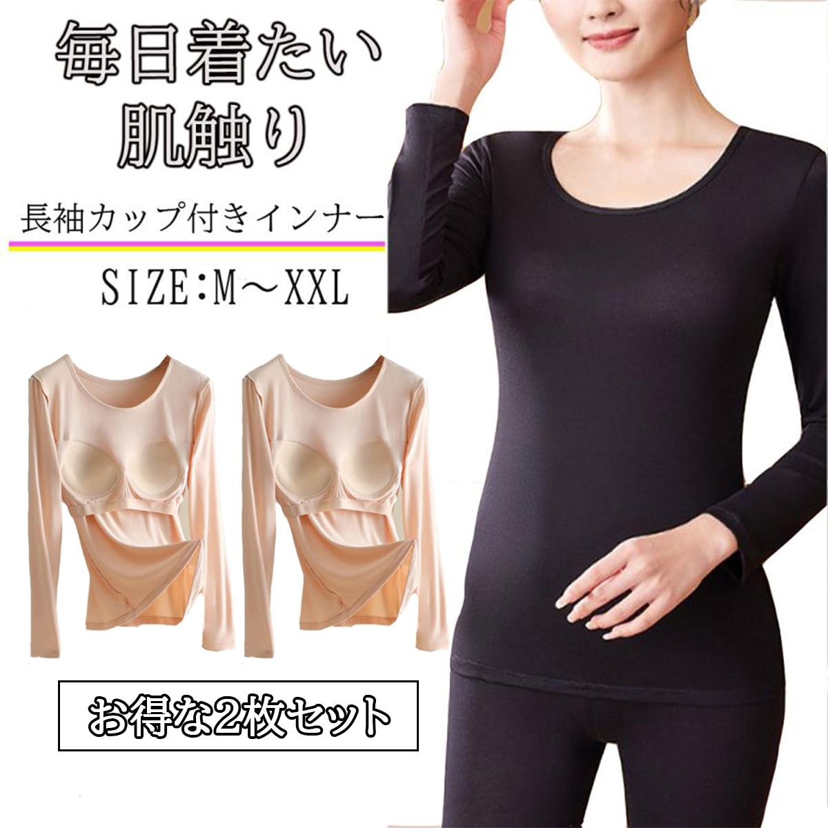 カップ付きインナー (2枚セット 1枚あたり1900円) 着ぶくれしない パットが外れない 長袖 薄手 パット付き 肌着 下着 ブラトップ