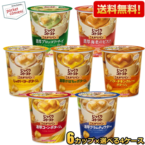 | ポッカサッポロのカップスープの選べる24カップセットです★ お好みの組み合わせを選んでくださいね♪ ただいまご選択可能な種類は・・・ じっくりコトコトこんがりパン(濃厚コーンポタージュ、濃厚クラムチャウダー、濃厚かぼちゃポタージュ、じゃがバターポタージュ、バターチキンカレー、濃厚海老のビスク、濃厚ブロッコリーチーズポタージュ) |