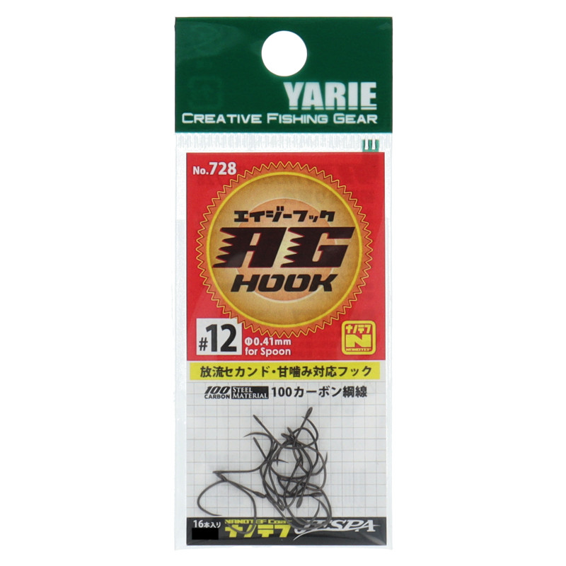 【ヤリエ】追いかけてくるのにバイトが弱い、スプーンにじゃれ付いてくるのにフッキングしない、また甘噛みはしているけれどフッキングに至らない、そんな状況を打破するためのフックです。フックポイントはストレート形状。刺さり重視のワイドゲイプ・ロングテーパー中細軸仕様。[JESPA AG HOOK]