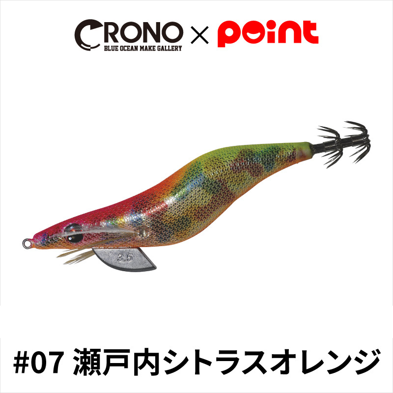 【クロノ/CRONO】(CRONO×point)pointオリジナルエギ!!元になったエギはクロノプロスタッフ西田哲郎氏が手作りで作成していた「西田エギ」。各エリアのスタッフとアイデアを出し合って生まれたご当地カラーのエギは、どれも使ってみたくなる魅力があります。薩摩伝承餌木の世界から伝承された布を活かしたテイストとクロノの塗装技術で美しくかつ釣果が出るエギに仕上がりました。
