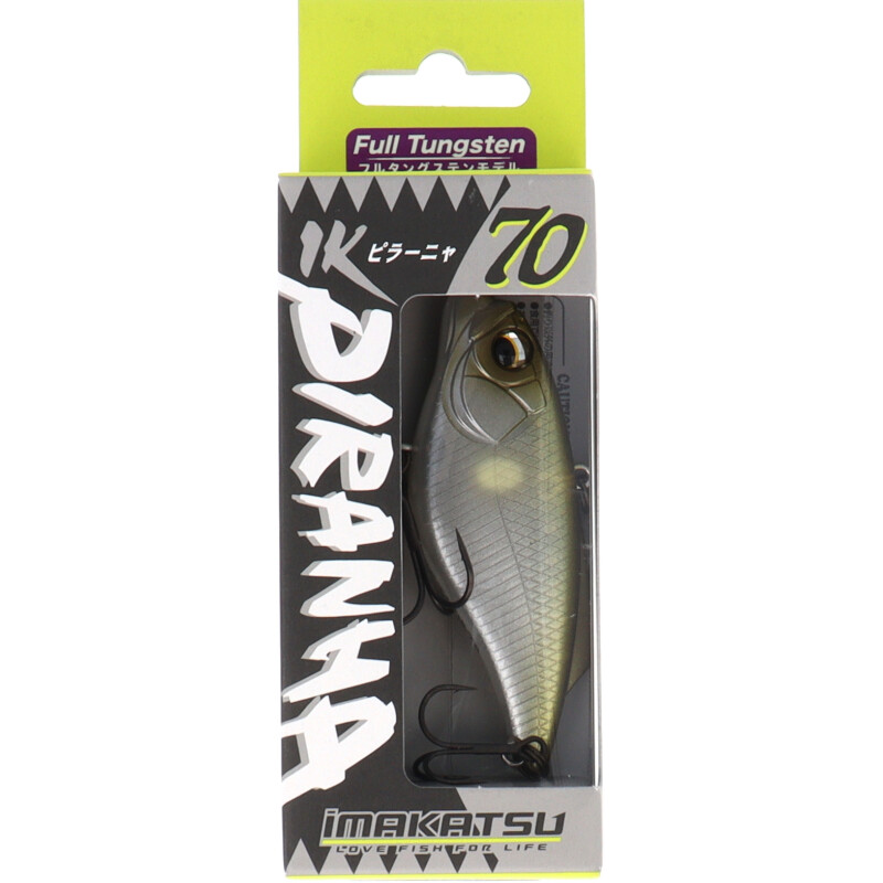 イマカツ ■ピラーニャ70 フルタングステン70サイズは琵琶湖をはじめとするビッグフィールドでその性能をフルに発揮。また、オカッパリでも超遠投性能により、遠くへキャストしたい時や、より広く探りたい時にも威力を発揮します。 ■フルタングステンタングステンという硬く重いラトルを採用。これによる効果は、甲高い音でのハイサウンドと強い波動。バスの居場所を見つけるサーチベイトとしてより有効です。 ●カラー:875 伝説ゴーストアユ ●サイズ:70 ●全長:70mm ●自重:20g ●タイプ:シンキング ●フック:有 ●釣り方、フィールド:淡水ルアー ●代表対象魚:ブラックバス|【イマカツ/IMAKATSU】絶対集魚力大音量型レンジキープ系バイブレーション究極に硬いタングステンラトルは他を圧倒する大音量でバスを誘います。そして、その硬いラトルがボディの壁に当たることで、強い衝撃波を発生。この効果で、琵琶湖のような広大なエリアにも負けないアピール力を発揮します。[PIRANHA Full Tungsten] TKM-16-02-12 SRS-254582497706062