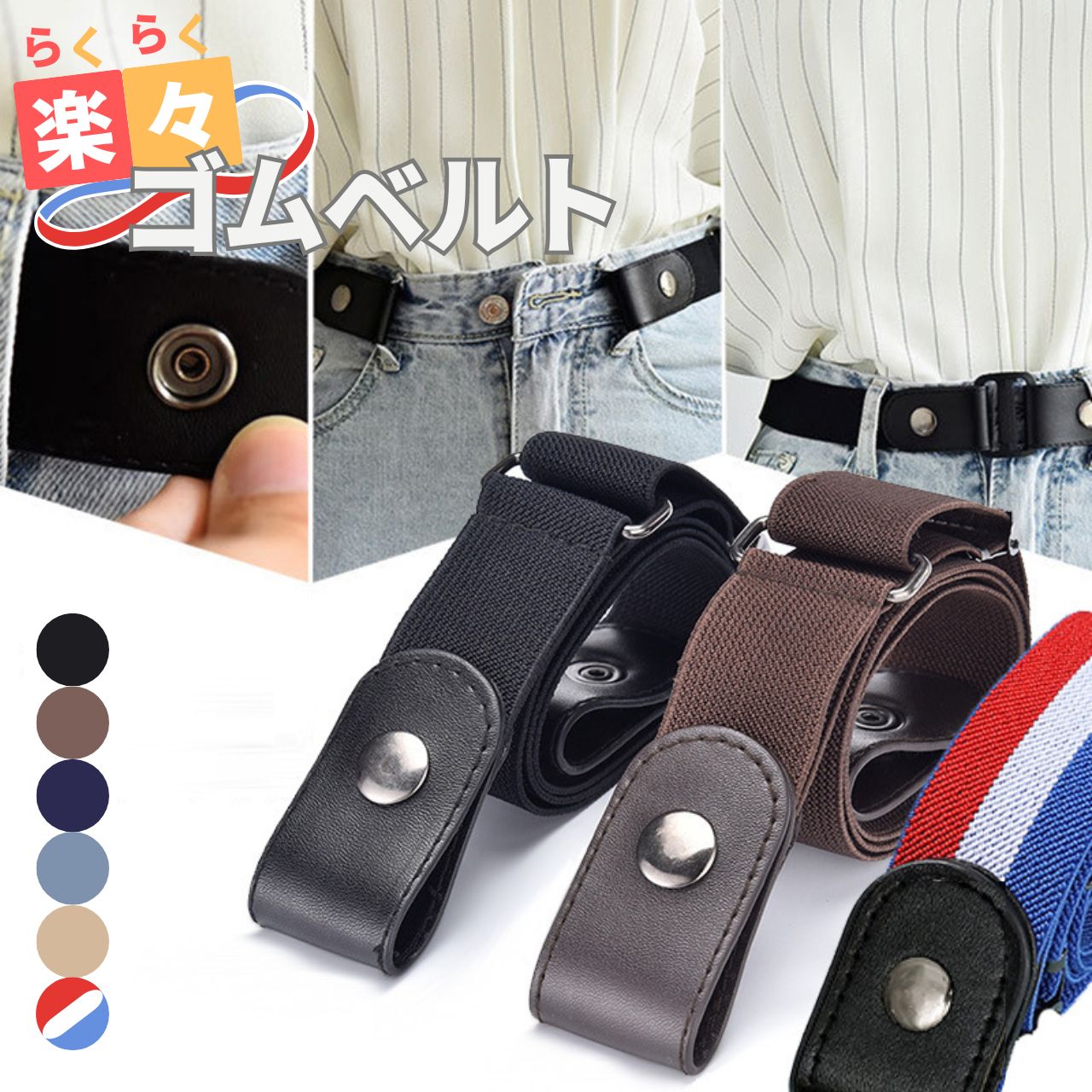 ゴムベルト レディース メンズ バックルなし おしゃれ ノーバックルベルト フリーサイズ 男女兼用 細魅せ 高見え ワンタッチ バックルレス 伸縮 楽々 楽ちん サイズ調節可能 無段階 シンプル