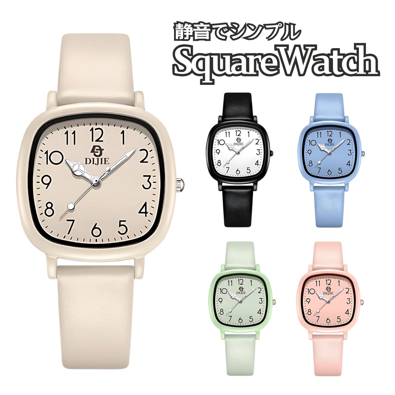 見やすい大きめ数字の文字盤とスクエア型ケースで、カジュアルからビジネスまで幅広く活躍します。