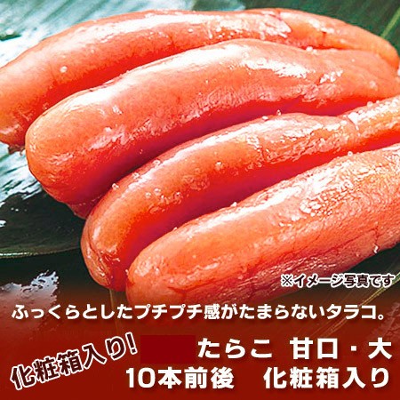 | 名称 | たらこ(甘口・大) | | タラコ 内容量 | 約500g・化粧箱入り | | たらこ 賞味期限 | たらこ は冷凍で30日。解凍後はお早めにお召し上がりください。 | | 保存方法 | タラコは、冷凍保存 | | 原材原産地 | すけそう鱈卵、食塩、調味料(有機酸等)、ソルビートル、ナイアシン、酸化防止剤(V.C)、甘味料(甘草、ステビア)着色料(赤102)、発色剤(亜硝酸Na)、(原材料の一部に大豆を含む)アメリカ産(加工地は北海道) | | 配送区分 | クール冷凍便 |