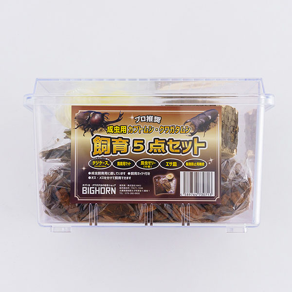カブトムシ・クワガタの飼育に便利な飼育5点セットです。成虫管理用としてご使用下さい。仕切り付きで、♂♀分けて飼育することが可能です。セット内容:デジケース、飼育用マット、昆虫ゼリー、エサ皿、転倒防止用樹皮、説明書