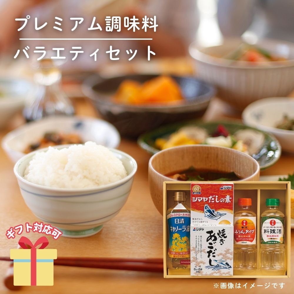 【セット内容】日の出料理酒・日の出割烹みりんタイプ(各400ml)・日清キャノーラ油(350g)・シマヤだしの素粉末(10g×6袋)・シマヤ焼きあごだし(8g×6袋)×各1