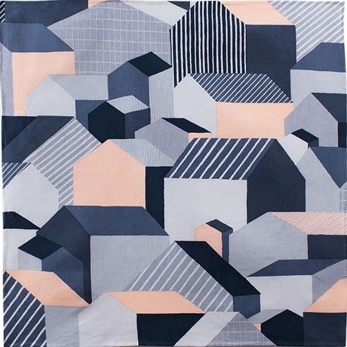 家々を7色で描いた町並みのデザインですが、包むとモザイク柄にも見え、ストライプやチェックの模様がアクセントになります。