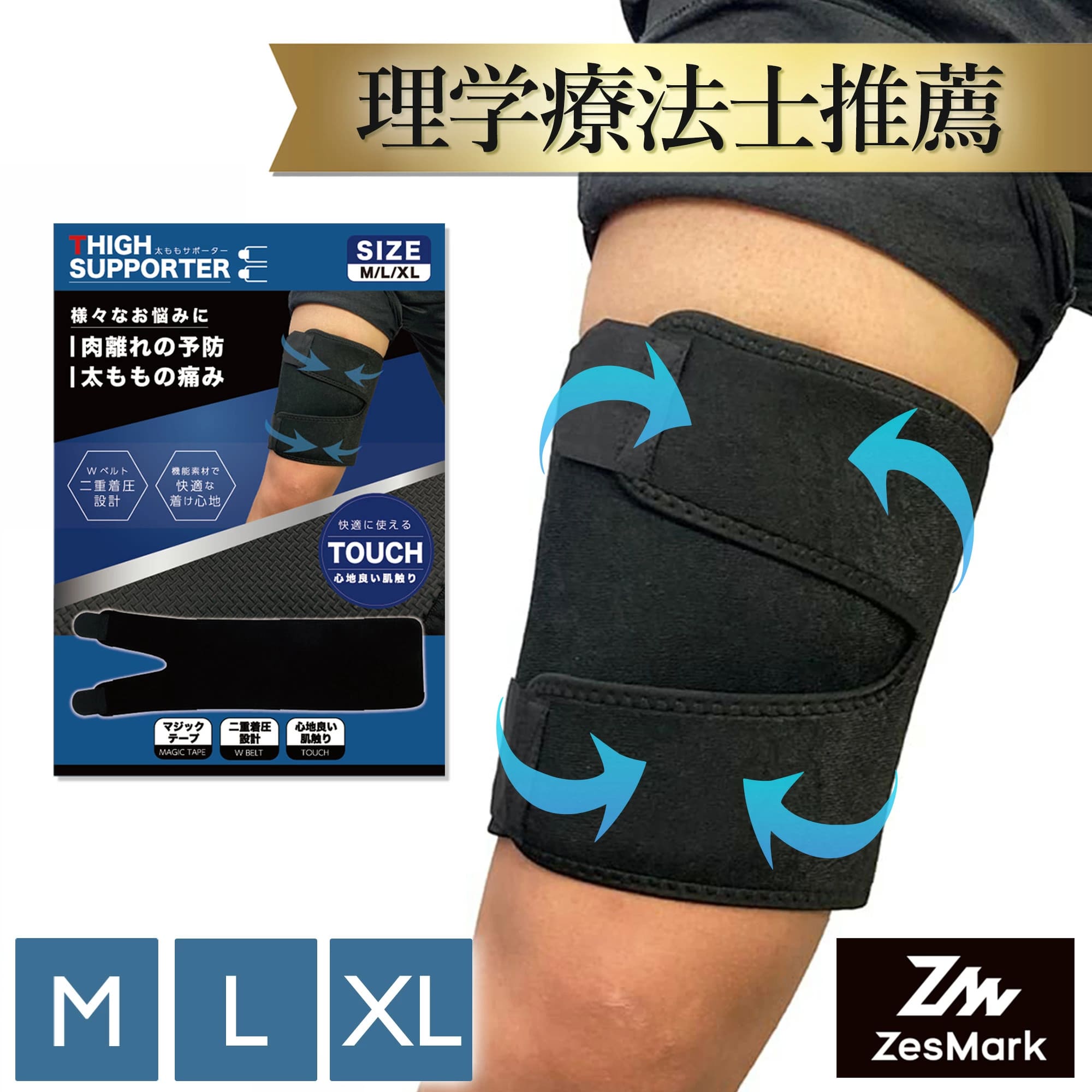 ・2本のベルトの二重着圧設計で太ももをしっかりサポートします。