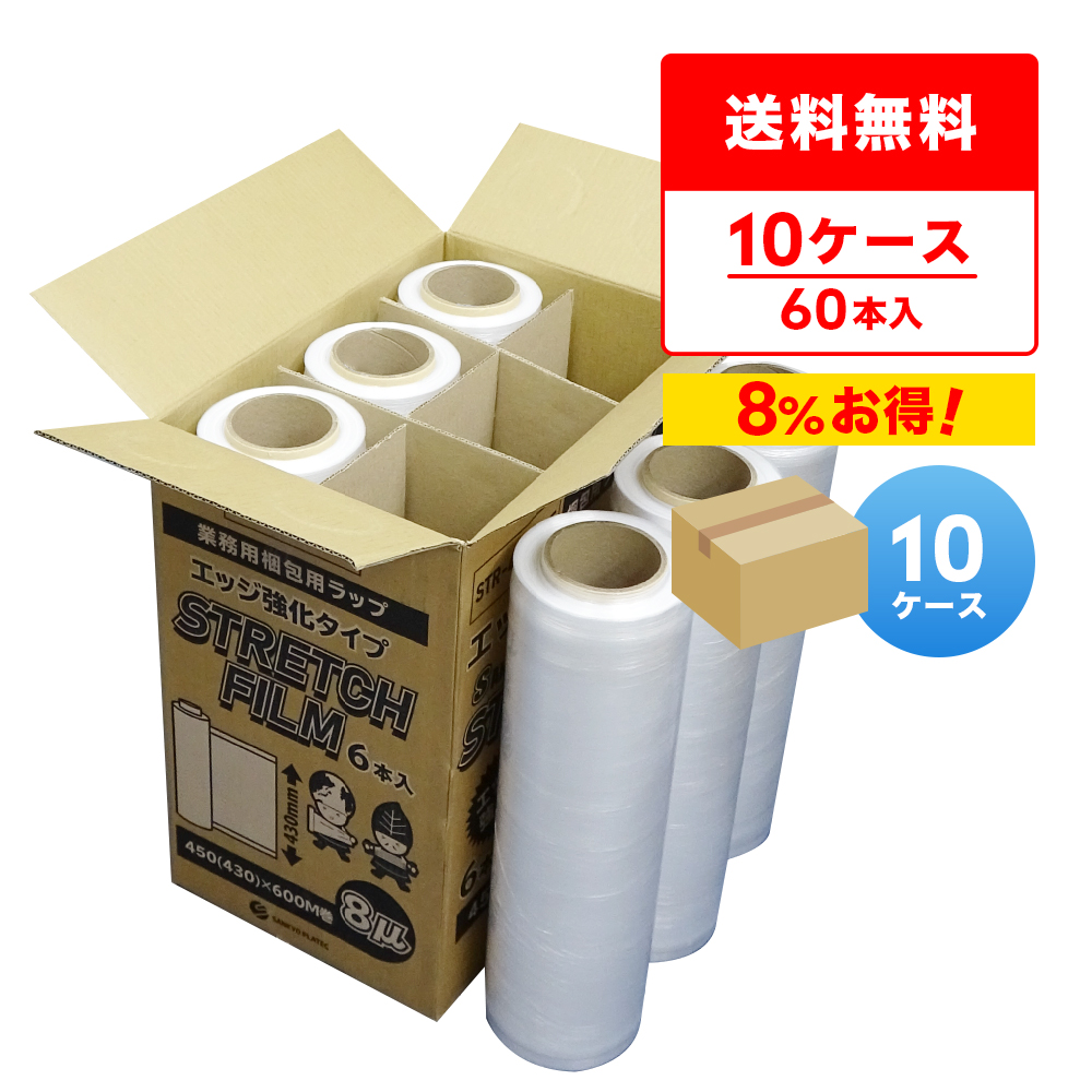 ストレッチフィルム エッジ強化タイプ 透明 450mm幅x600m 8μ 6本x10箱 STR-450-08E-10 サンキョウプラテック