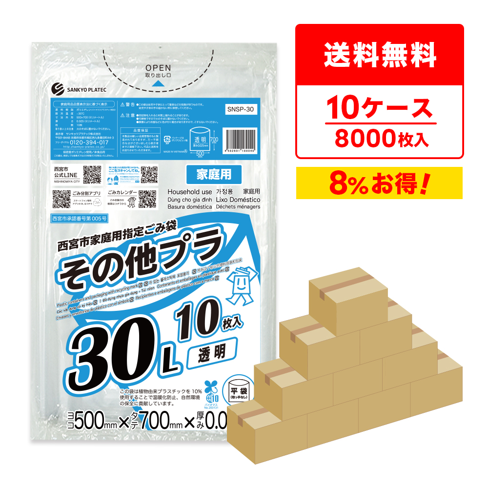 西宮市 家庭用 指定 ゴミ袋 その他プラ 30リットル 透明 50x70cm 0.025mm厚 10枚x80冊x10箱 SNSP-30-10 サンキョウプラテック