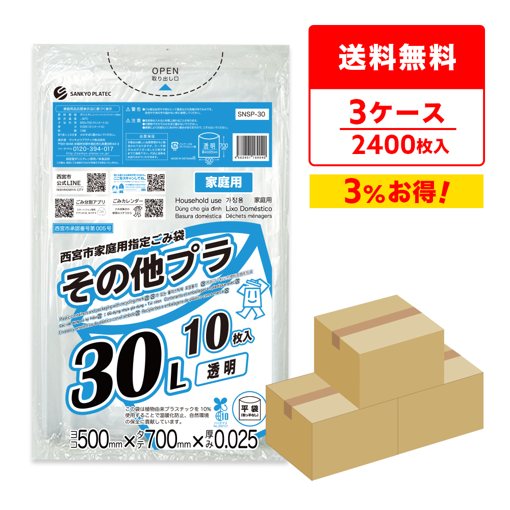 西宮市 家庭用 指定 ゴミ袋 その他プラ 30リットル 透明 50x70cm 0.025mm厚 10枚x80冊x3箱 SNSP-30-3 サンキョウプラテック