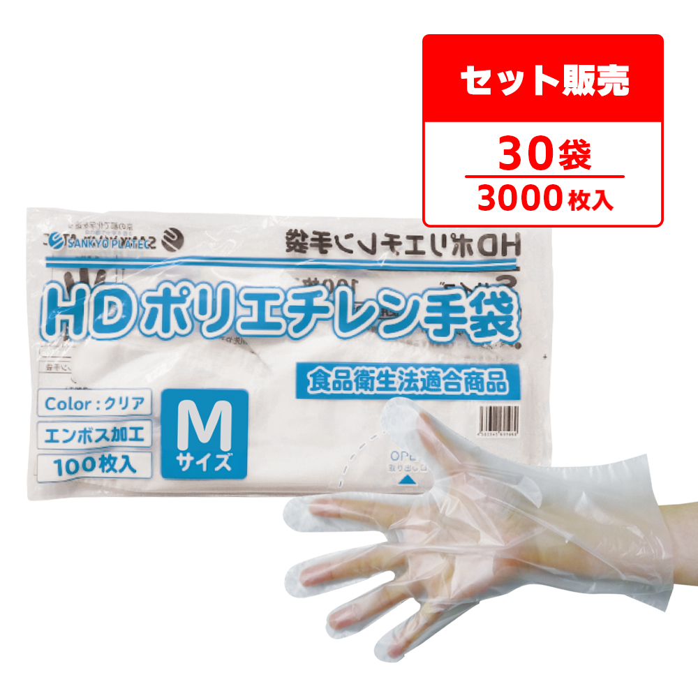 ポリエチレン手袋 HD Mサイズ 半透明 約24x28.3 100枚x30冊 HPGM-100bara30 片エンボス サンキョウプラテック