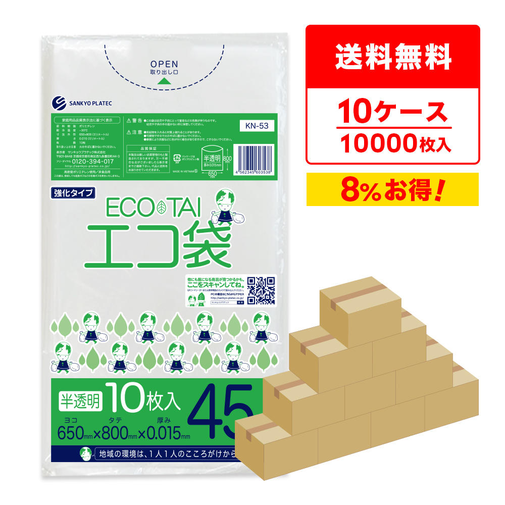 ゴミ袋 45L 半透明 65x80cm 0.015mm厚 10枚x100冊x10箱 KN-53-10 サンキョウプラテック