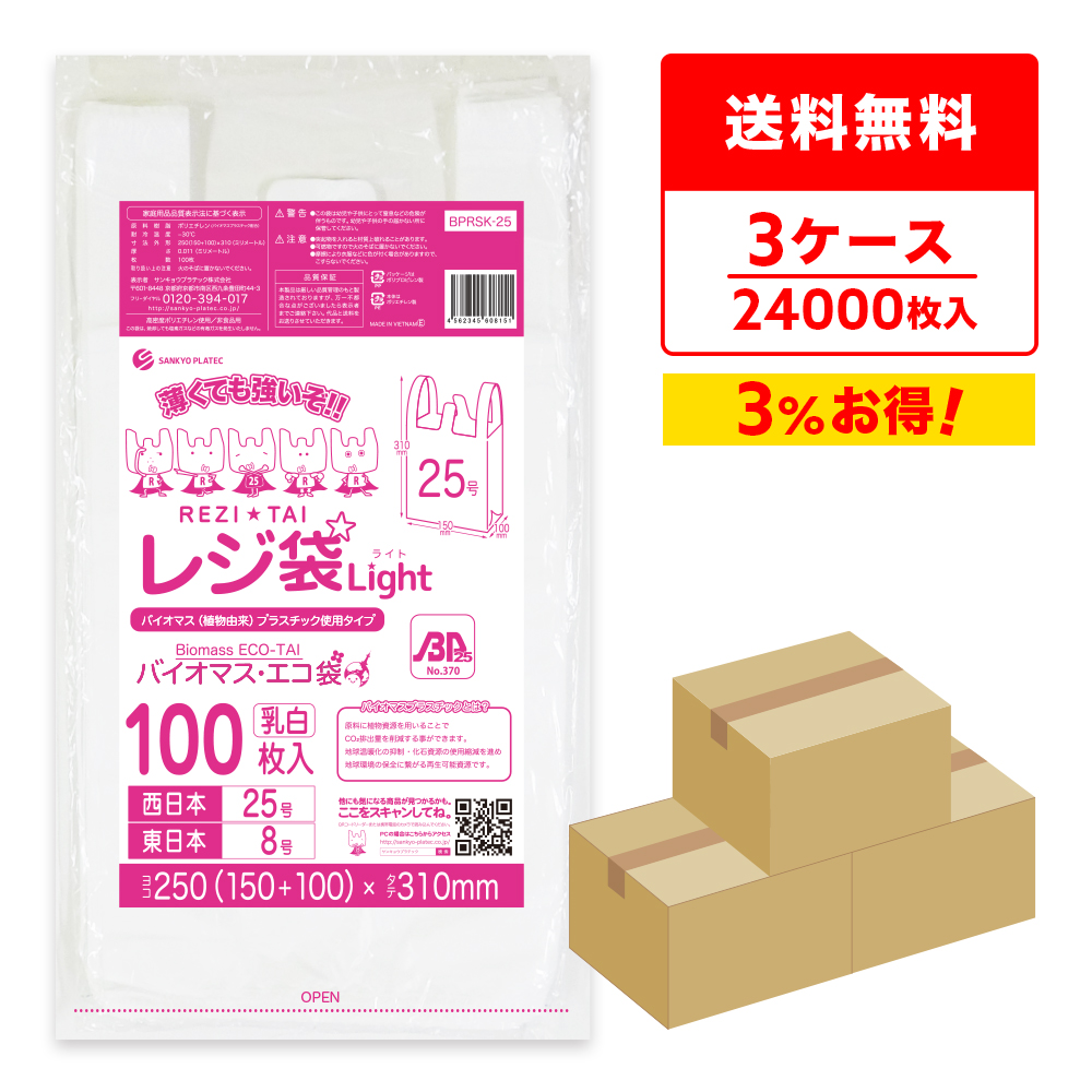 バイオマス 25%配合 レジ袋 厚手 西日本 25号 (東日本8号) ブロック有 15x31cm マチ10cm 0.013mm厚 乳白 100枚x80冊x3箱 BPRS-25-3 サンキョウプラテック
