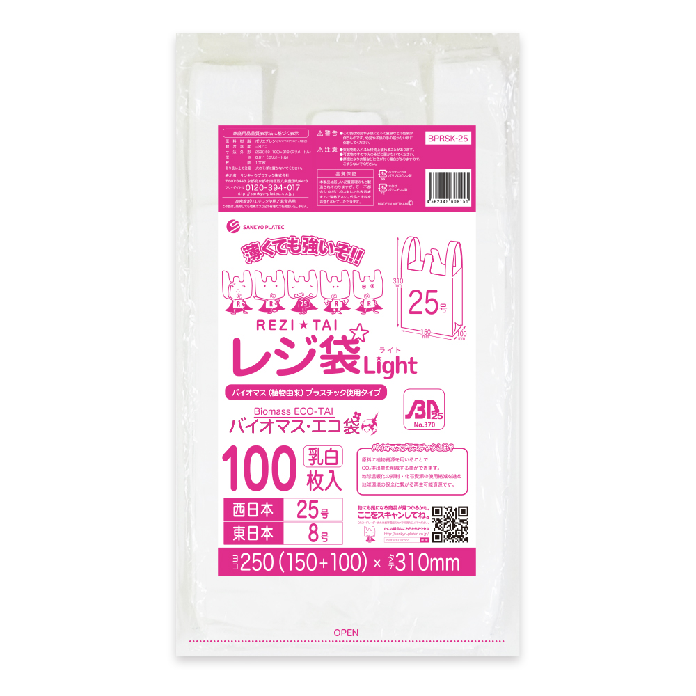 バイオマス 25%配合 レジ袋 厚手 西日本 25号 (東日本8号) ブロック有 15x31cm マチ10cm 0.013mm厚 乳白 100枚 BPRS-25bara サンキョウプラテック