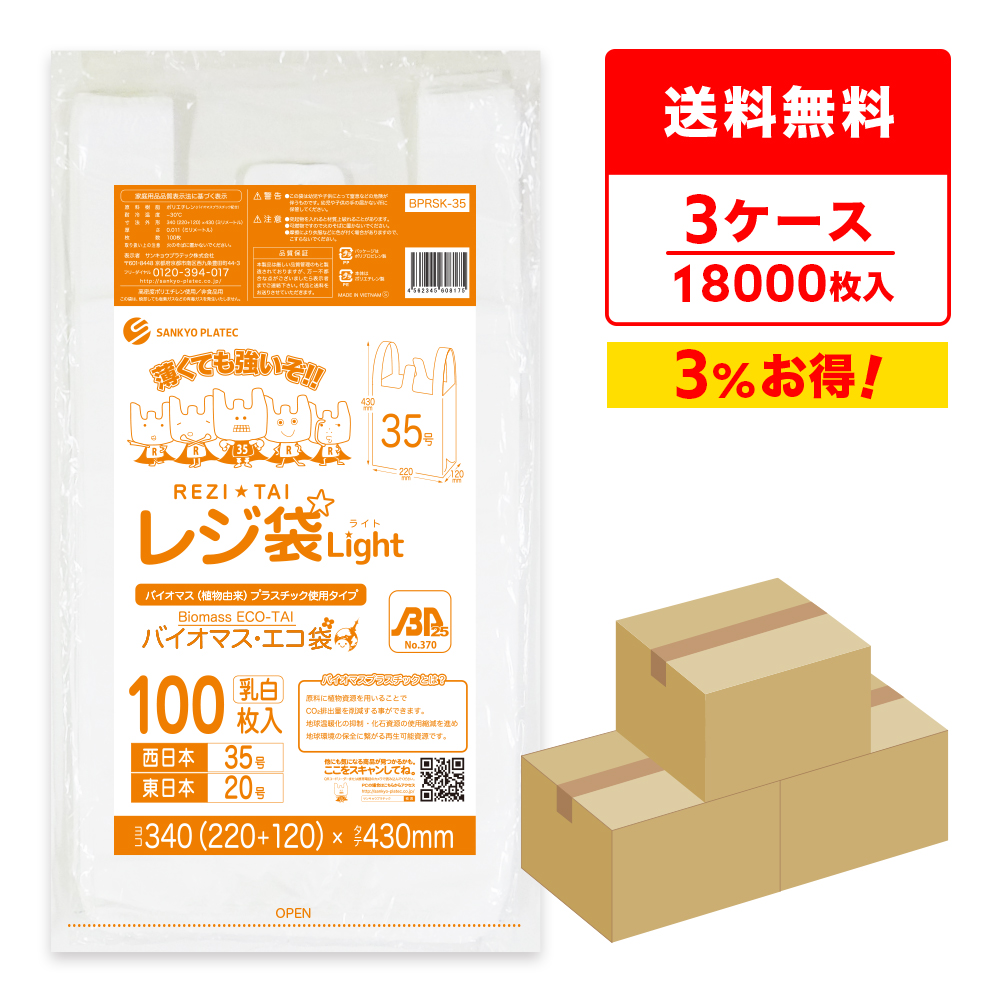 バイオマス 25%配合 レジ袋 薄手 西日本 35号 (東日本20号) ブロック有 22x43cm マチ12cm 0.011mm厚 乳白 100枚x60冊x3箱 BPRSK-35-3 サンキョウプラテック