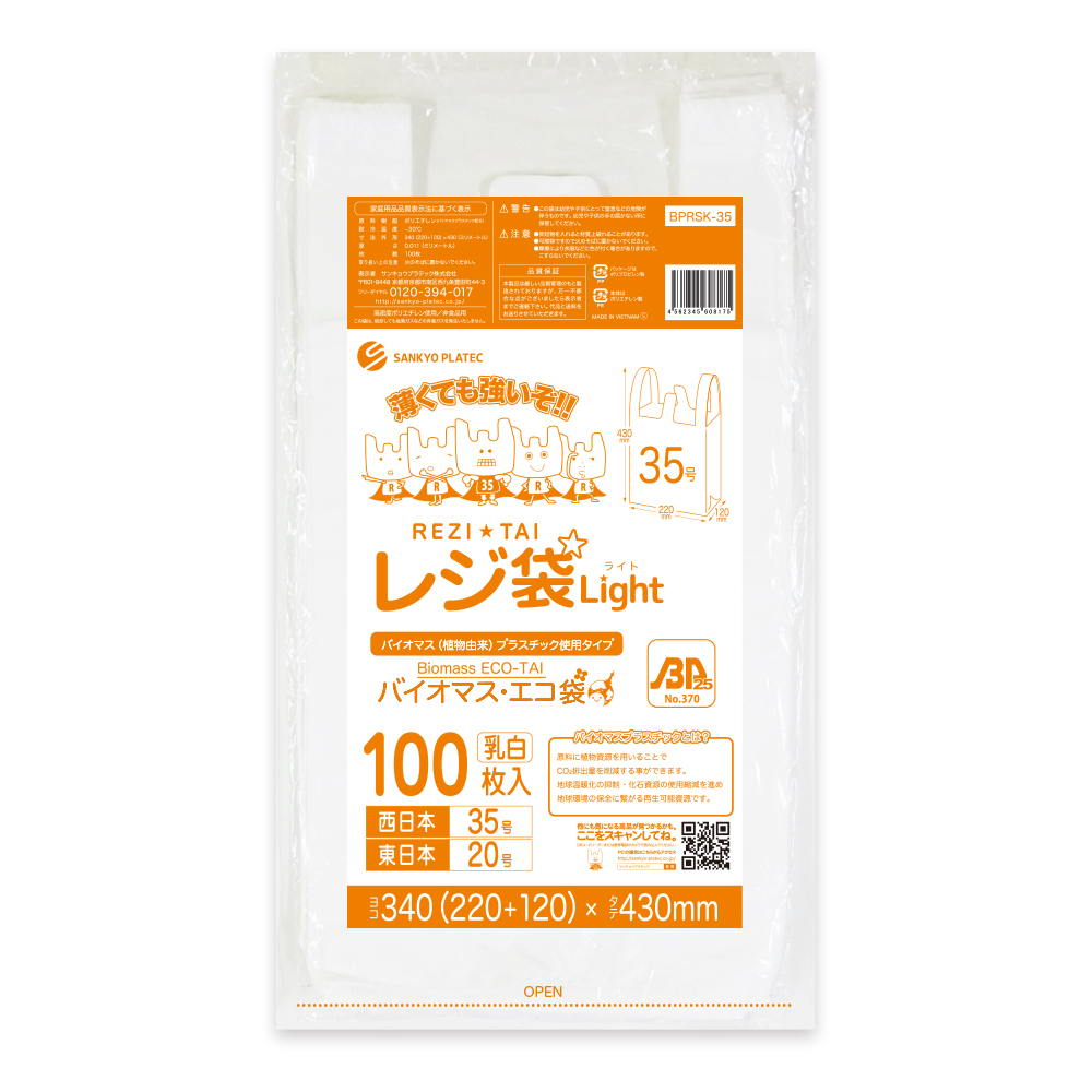 バイオマス 25%配合 レジ袋 薄手 西日本 35号 (東日本20号) ブロック有 22x43cm マチ12cm 0.011mm厚 乳白 100枚 BPRSK-35bara サンキョウプラテック