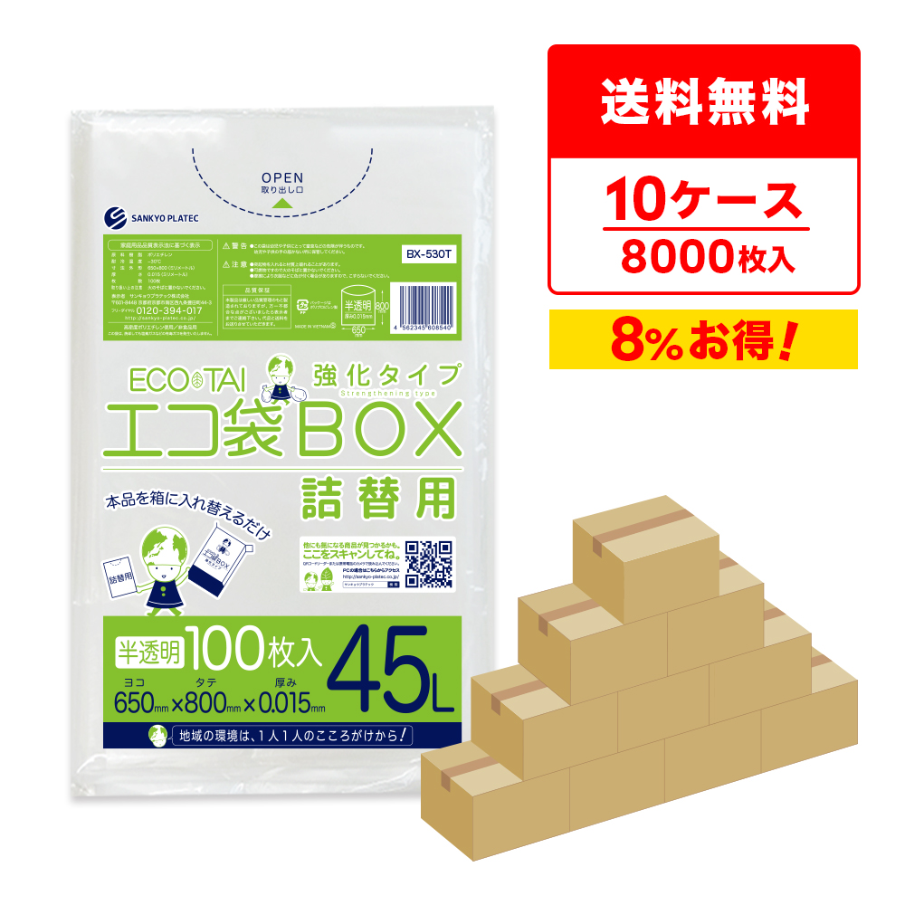 ゴミ袋 箱タイプ 詰替用 45L 半透明 65x80cm 0.015mm厚 100枚x8冊x10箱 BX-530T-10 サンキョウプラテック