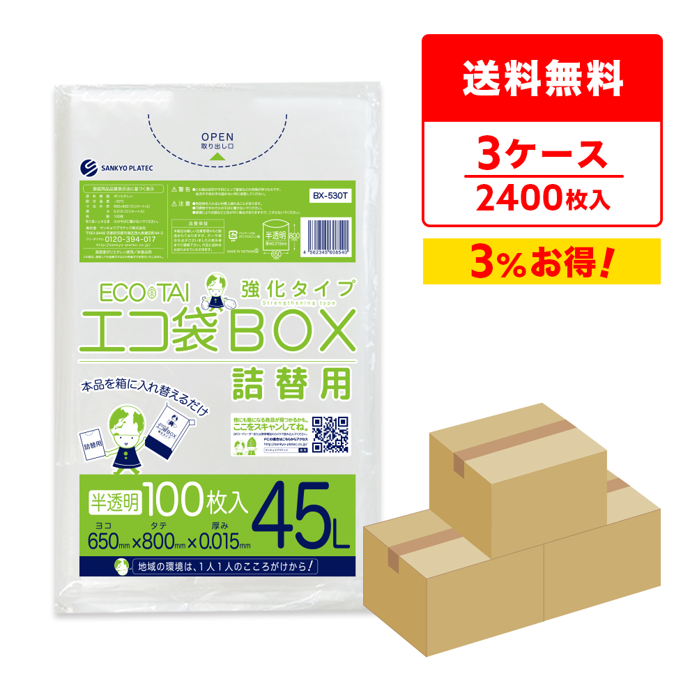 ゴミ袋 箱タイプ 詰替用 45L 半透明 65x80cm 0.015mm厚 100枚x8冊x3箱 BX-530T-3サンキョウプラテック