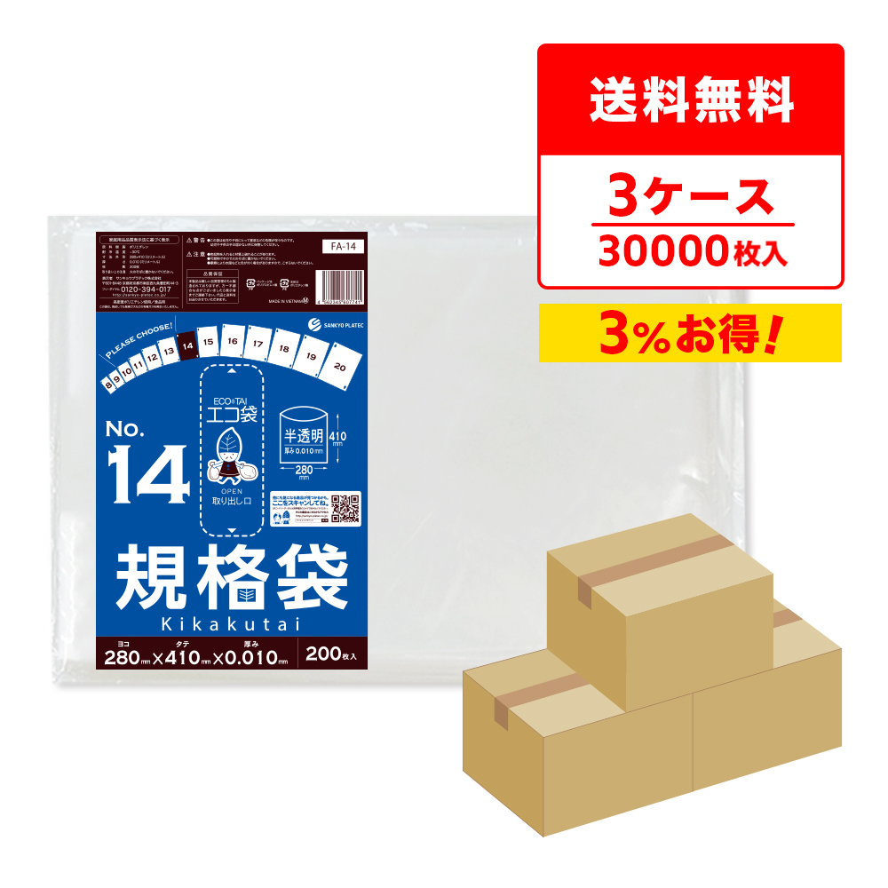規格袋 14号 28x41cm 0.010mm厚 半透明 200枚x50冊x3箱 FA-14-3 食品検査適合 RoHS指定 サンキョウプラテック