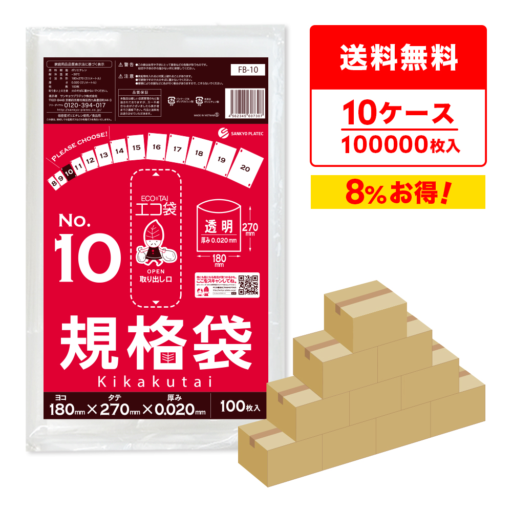 規格袋 10号 18x27cm 0.020mm厚 透明 100枚x100冊x10箱 FB-10-10 食品検査適合 RoHS指定 サンキョウプラテック