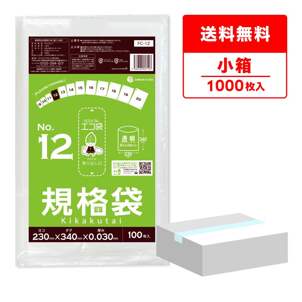 規格袋 12号 23x34cm 0.030mm厚 透明 100枚x10冊 FC-12kobako 食品検査適合 RoHS指定 サンキョウプラテック