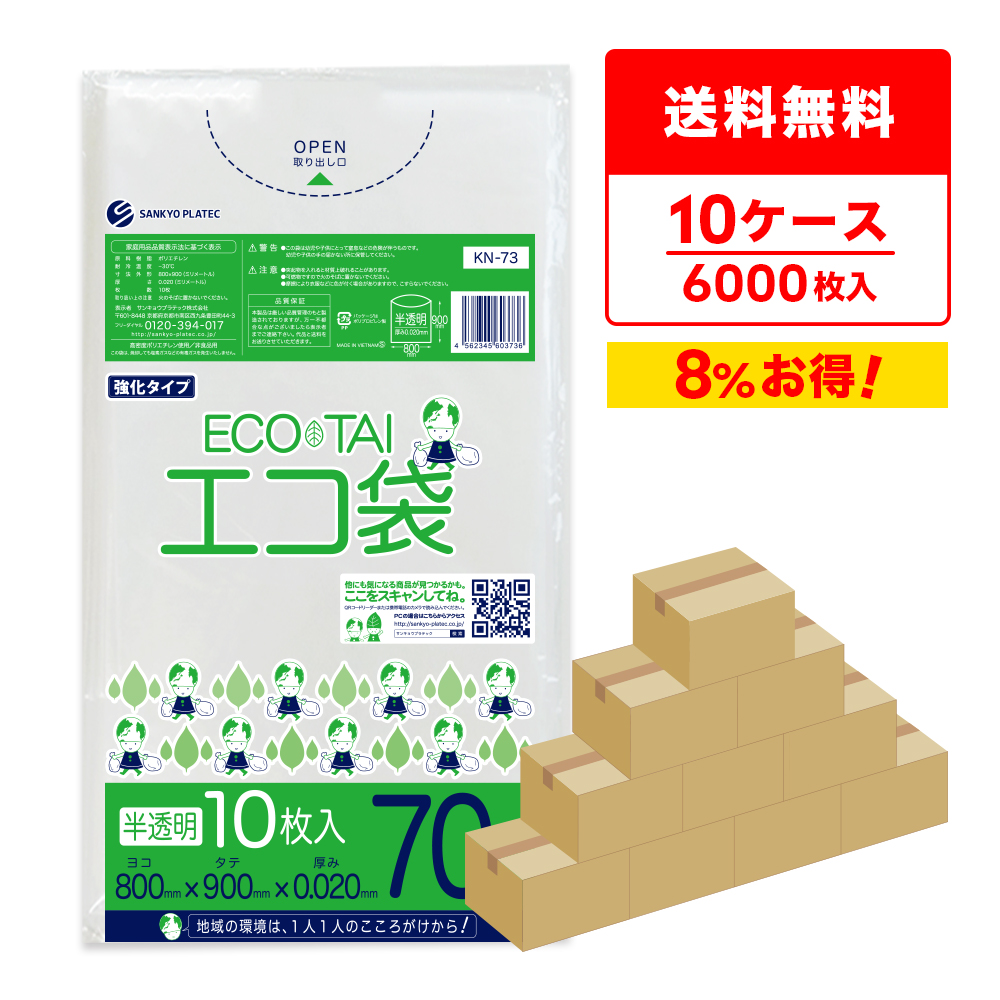 ゴミ袋 70L 半透明 80x90cm 0.020mm厚 10枚x60冊x10箱 KN-73-10 サンキョウプラテック