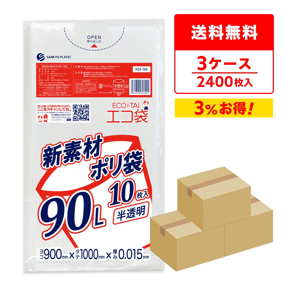 ゴミ袋 90L 半透明 90x100cm 0.015mm厚 10枚x80冊x3箱 KN-94-3 サンキョウプラテック